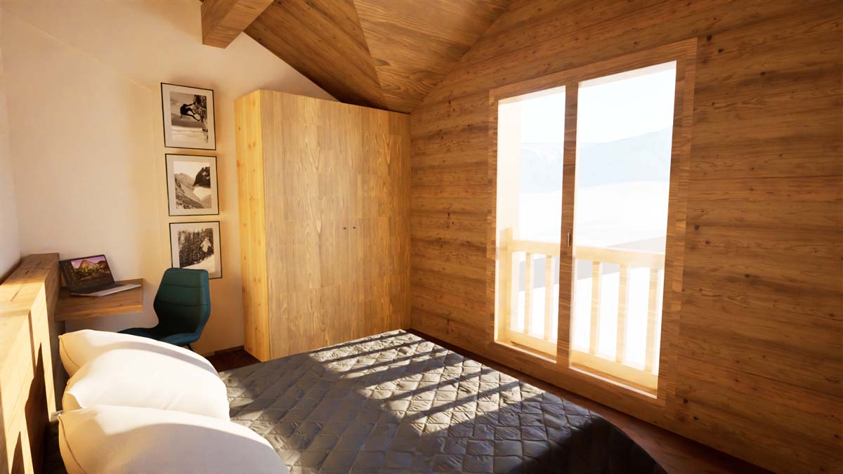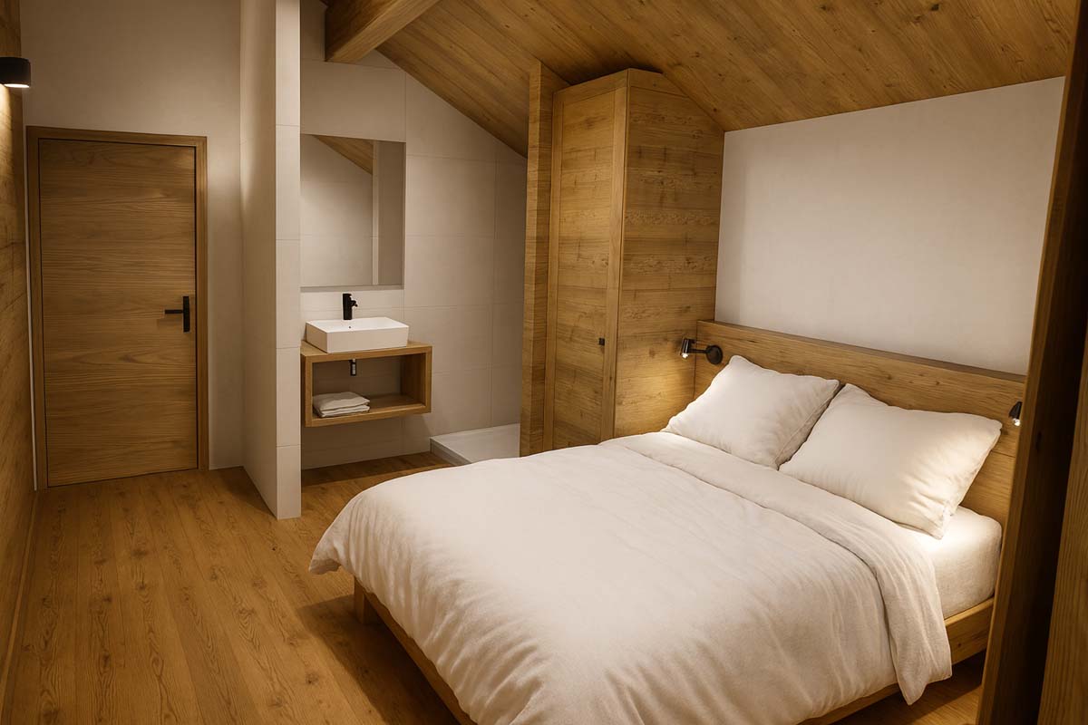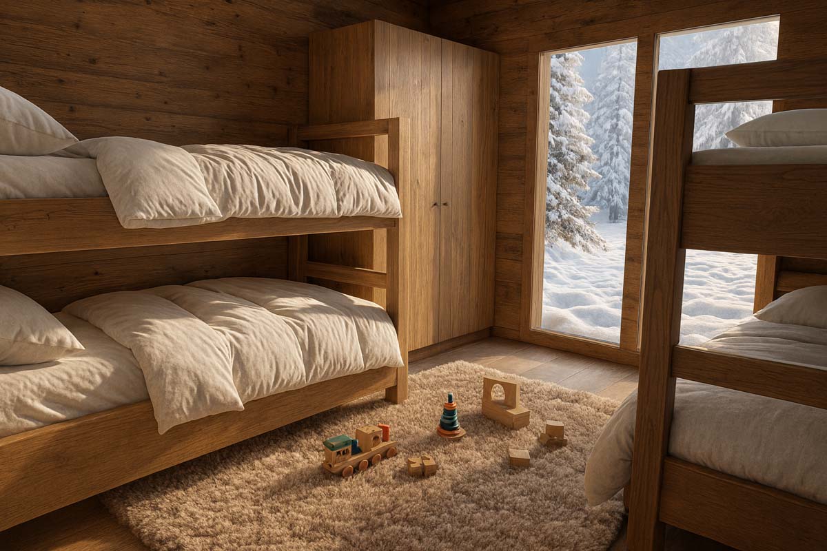 - Placards bois fabriqués sur mesure dans toutes les chambres avec têtes de lit. Local ski agencé.