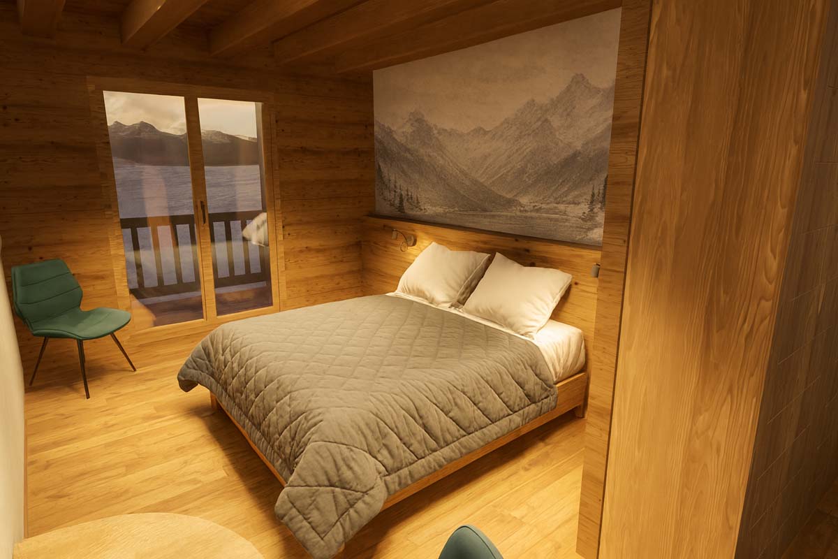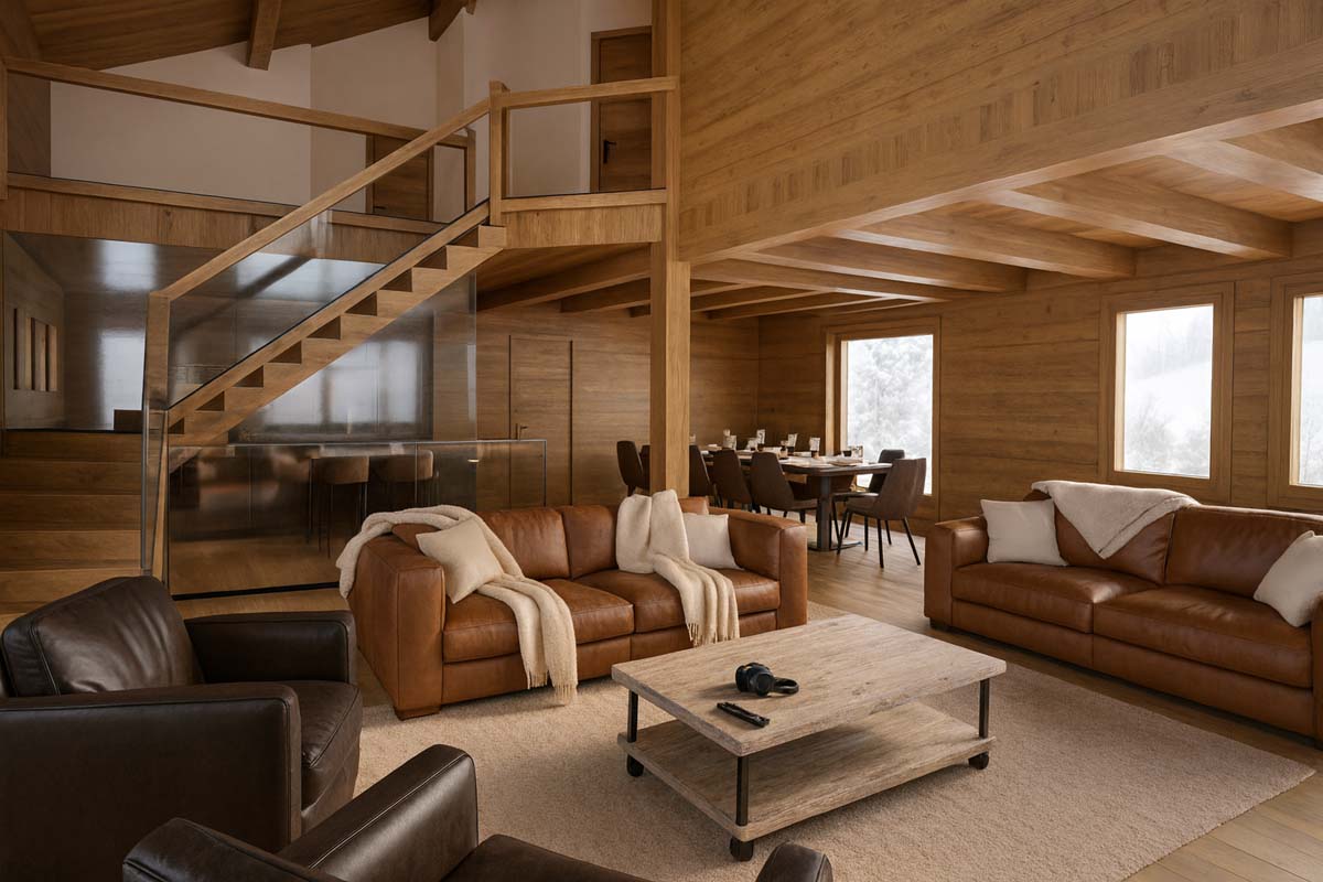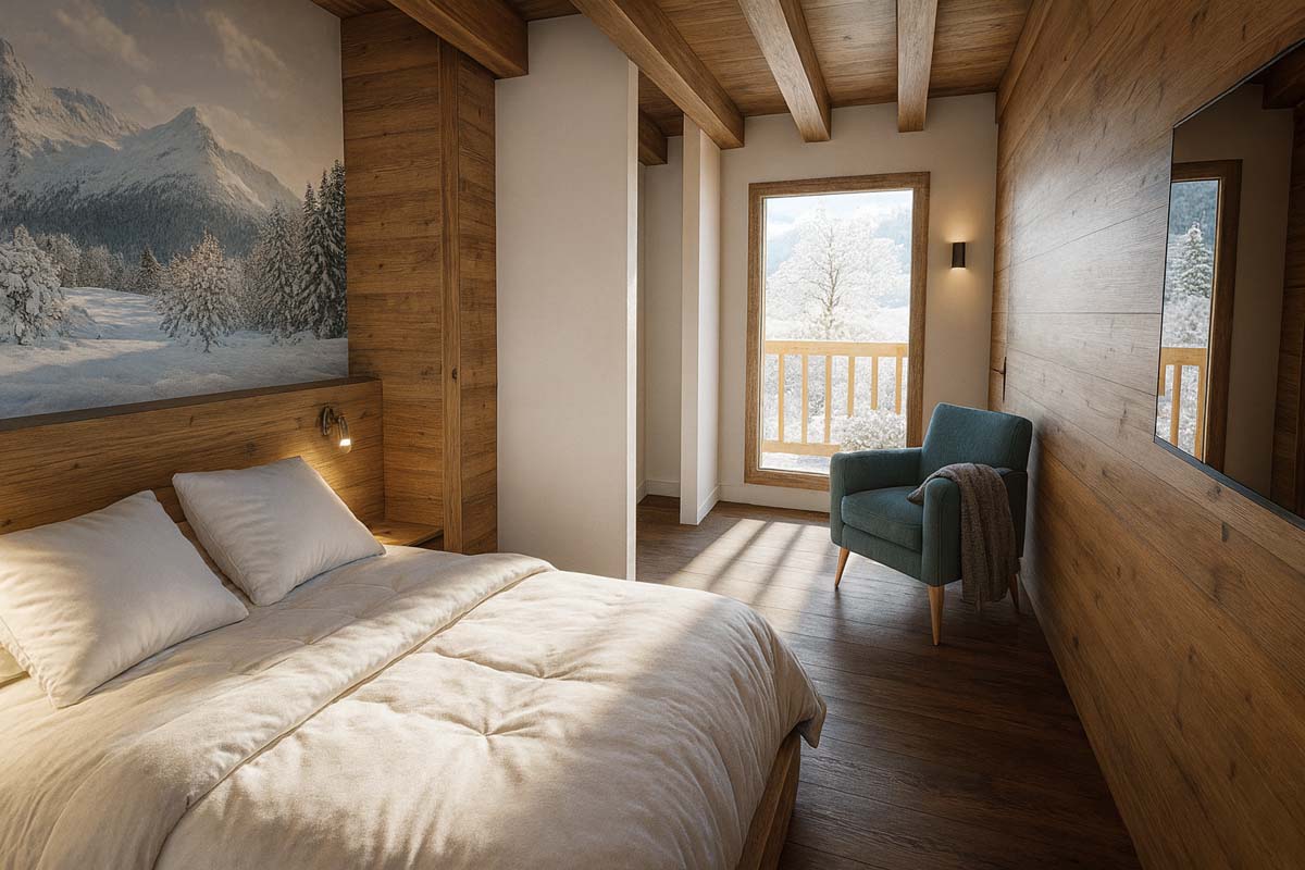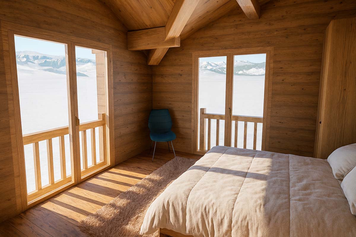 - Intérieur bois, avec parquet chêne dans les chambres et les pièces de vie